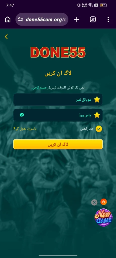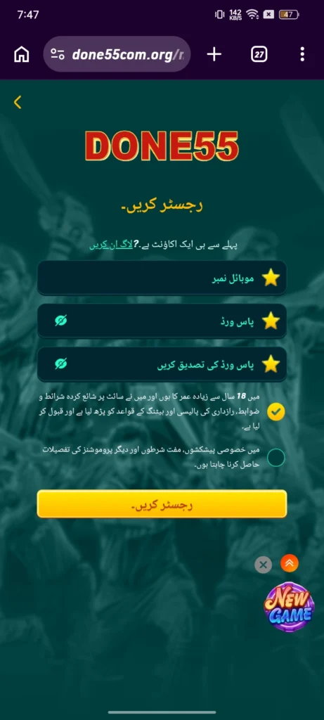 Getting onto the Done 55 game Earning App in Pakistan is genuinely one of the fastest sign-ups you will ever do. Pop in your phone number, create a password, and you’re in. The whole thing takes maybe two minutes,s and then you are straight into the games. No long for, ms no waiting aro, und ja ust quick and simple setup.